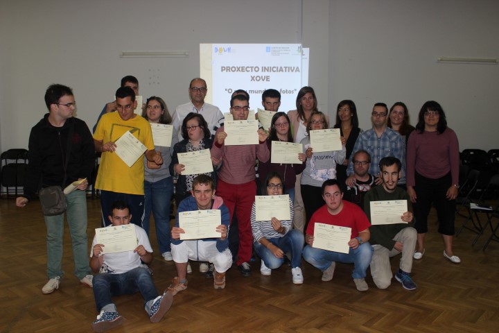 A directora xeral de Xuventude e Voluntariado, Cecilia Vázquez, e o presidente de Down Galicia, Delmiro Prieto, puxeron esta mañá o broche final ó obradoiro de fotografía “O meu mundo en fotos” coa entrega dos diplomas ós participantes no proxecto. Esta actividade, organizada por Down Galicia, está subvencionada pola Consellería de Traballo e Benestar, que destinou 4.000 euros a través do programa Iniciativa Xove para a súa posta en marcha. O seu principal obxectivo é favorecer a participación das persoas coa síndrome de Down e/ou discapacidade intelectual en actividades sociais, culturais e de lecer, das que na maioría das ocasións están totalmente á marxe provocando un alto risco de exclusión social. Este proxecto, no que participan 33 persoas coa síndrome de Down e/ou discapacidade intelectual de todas as entidades Down de Galicia, está composto por un obradoiro de iniciación á fotografía, a planificación das sesións de fotografía na rúa, as propias sesións e o visionado, análise e presentación dos traballos realizados por cada participante nunha sesión conxunta.