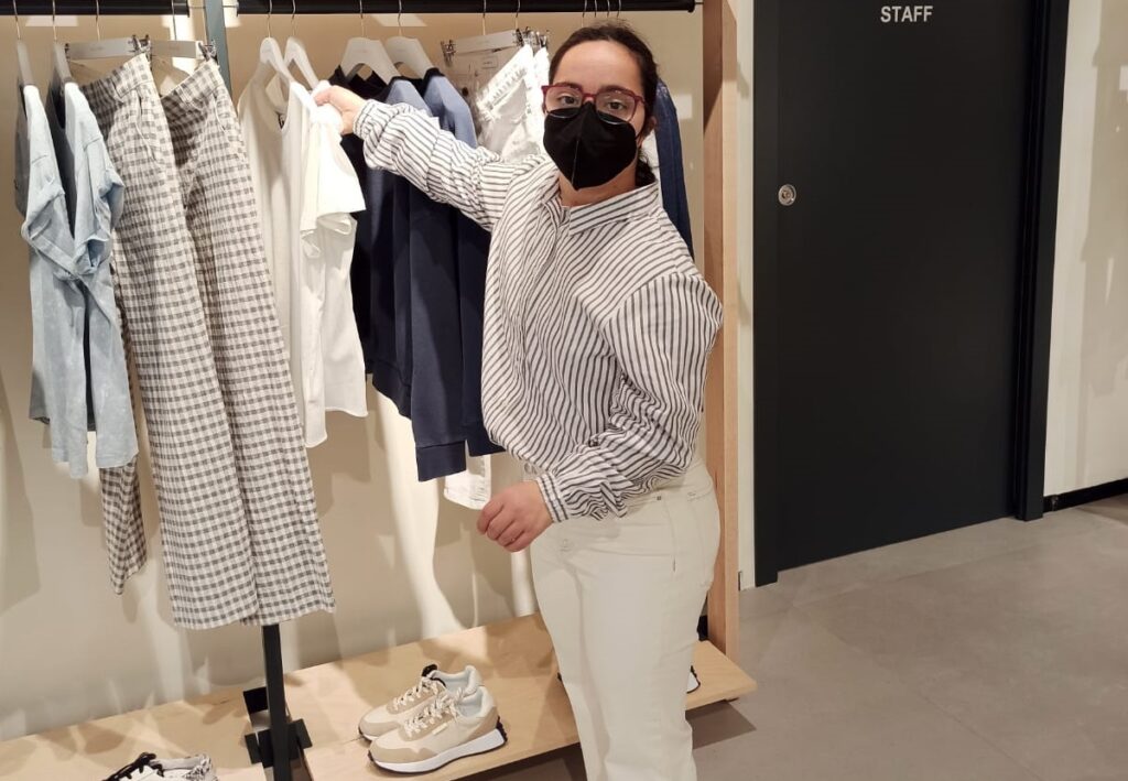 Iris Curra, unha moza que forma parte do Servizo de Emprego con Apoio de Down Vigo, acaba de incorporarse ao equipo de traballo que a tenda Scalpers, marca de retail especializada en moda, ten na céntrica rúa Príncipe da cidade olívica.